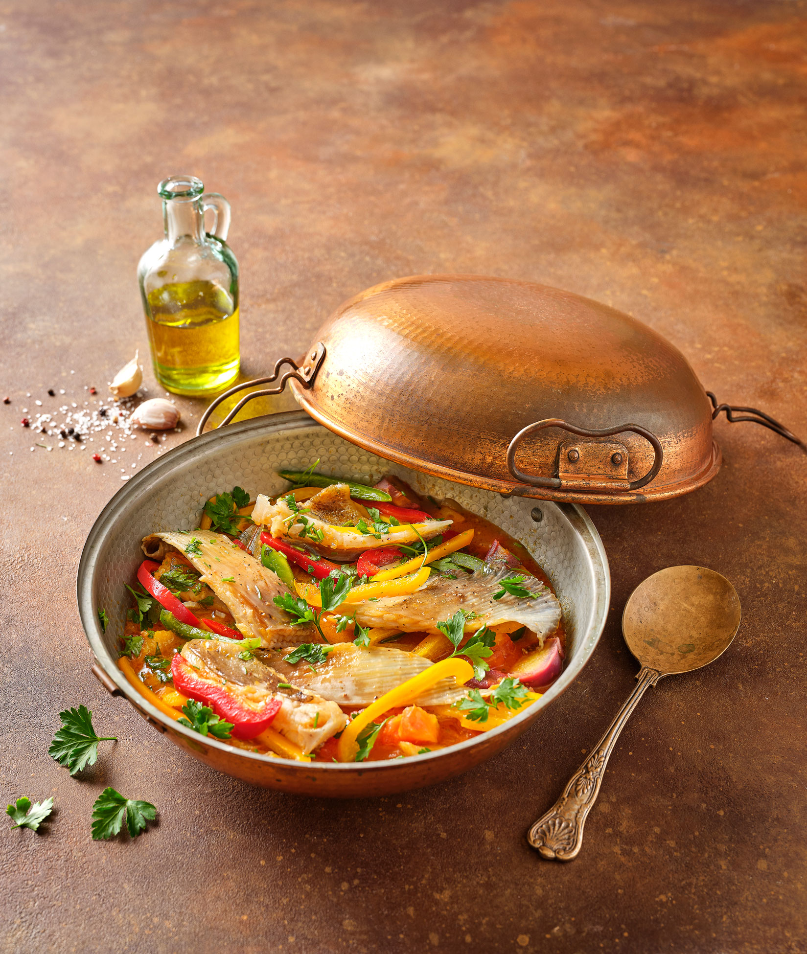 Quando a raia estiver quase pronta juntar os pimentos, fechar a cataplana e deixar terminar a confeção.