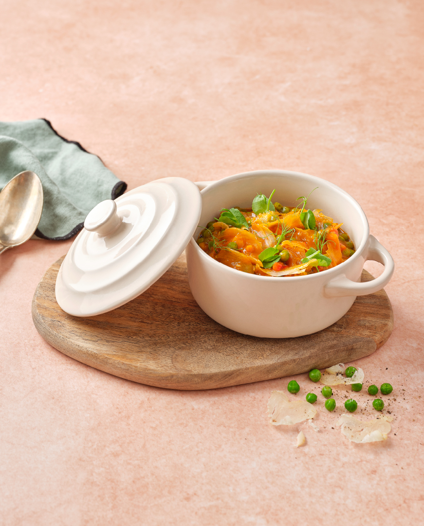 Junte de seguida as ervilhas e a cenoura em brunesa e deixe cozinhar por mais 10 minutos. Envolva depois as lascas de Lombo de Bacalhau Dourado.