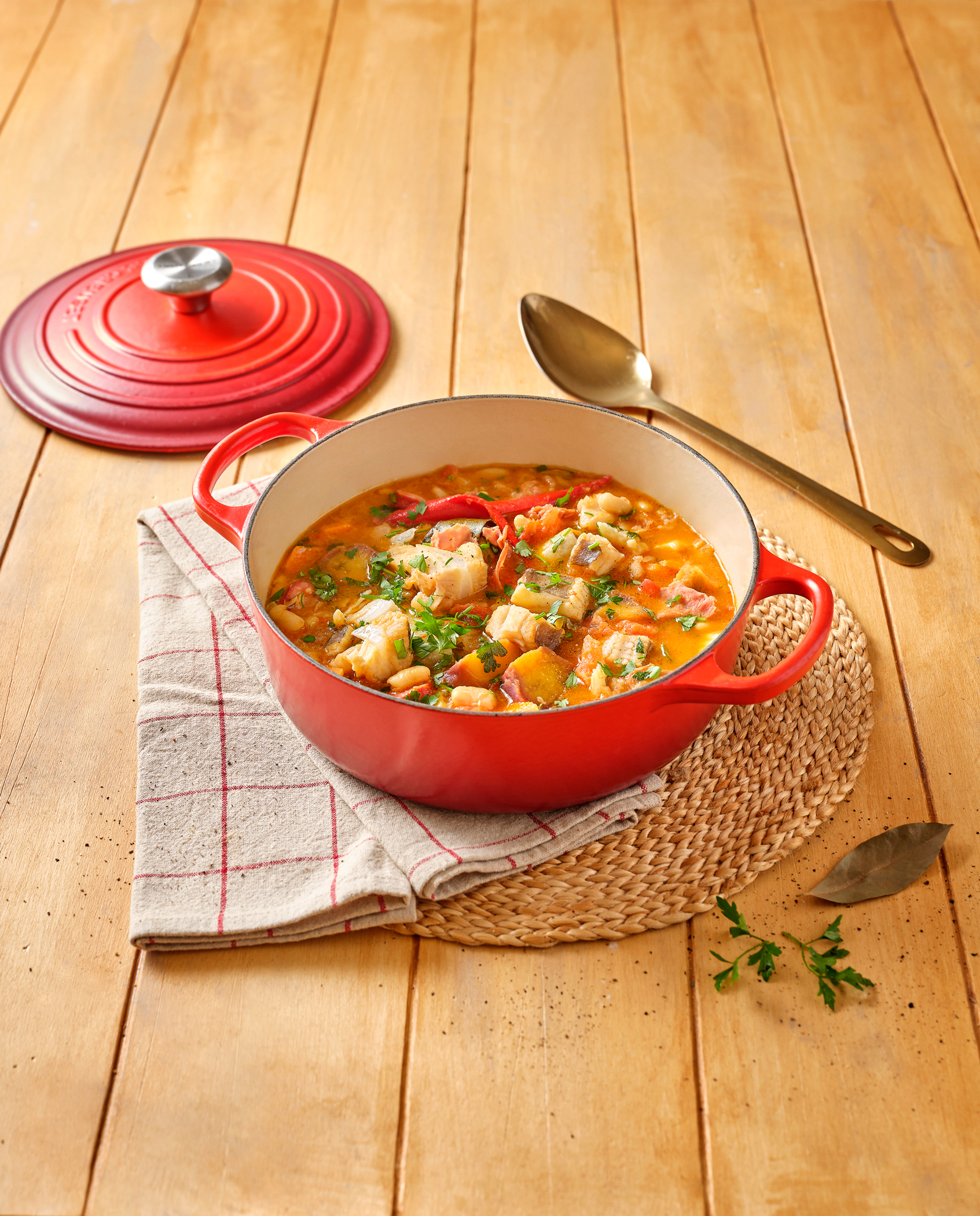 Por fim, adicionar a raia demolhada em cubos, deixar cozinhar mais 10 minutos e por fim retificar temperos com sal, pimenta preta e adicionar salsa picada.