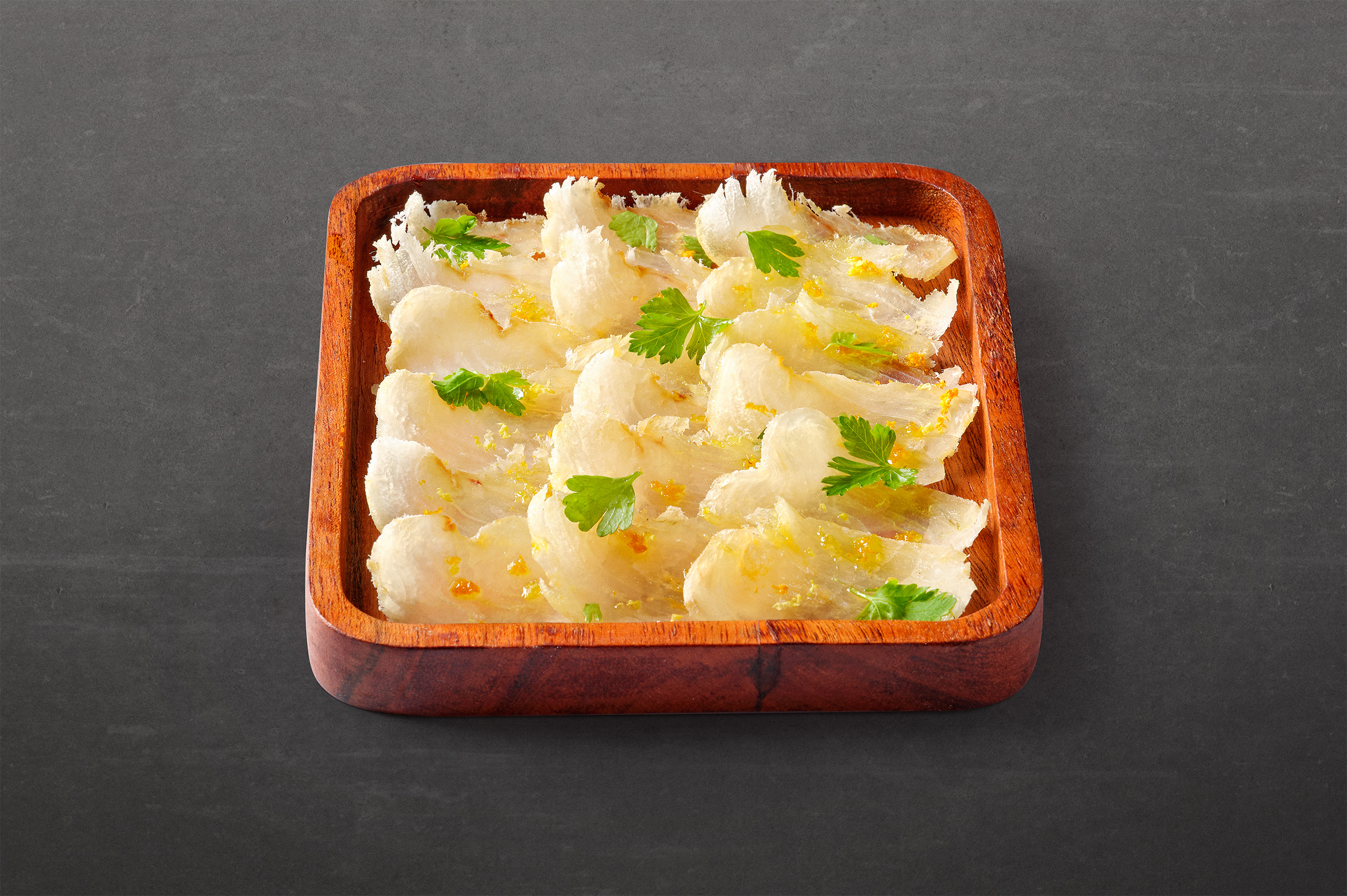 Para finalizar, acrescente alguns rebentos de salsa e de mostarda sobre as lâminas de bacalhau.