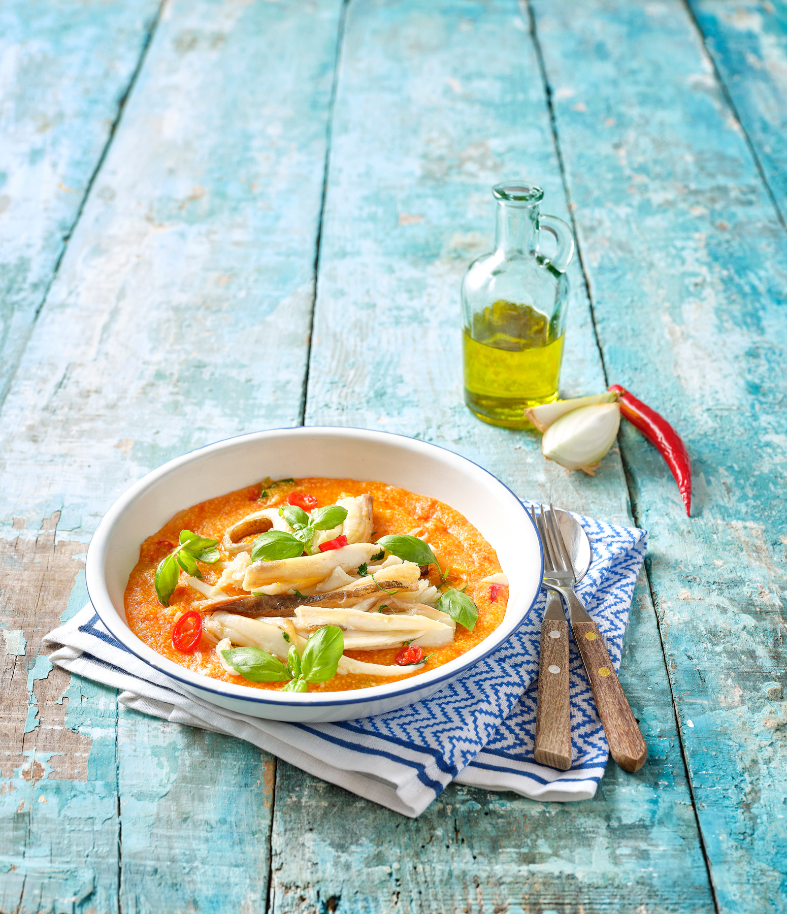 Ao empratar, colocar o xerém na base, a raia confitada no cimo e finalizar com manjericão.