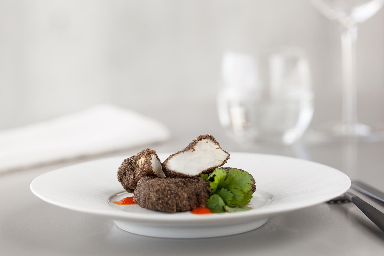Serve the loins with the pepper purée and garnish with the chopped coriander.