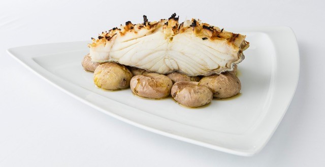 Place the potatoes with salt in a baking tray and put it in the oven. Bake at 170ᵒC for about 50 minutes. In another tray, place the Lugrade Cod loins and drizzle with olive oil. Roll the garlic and roast at the same temperature as the potatoes for 12 minutes. Serve with the olive oil from the cod baking tray.