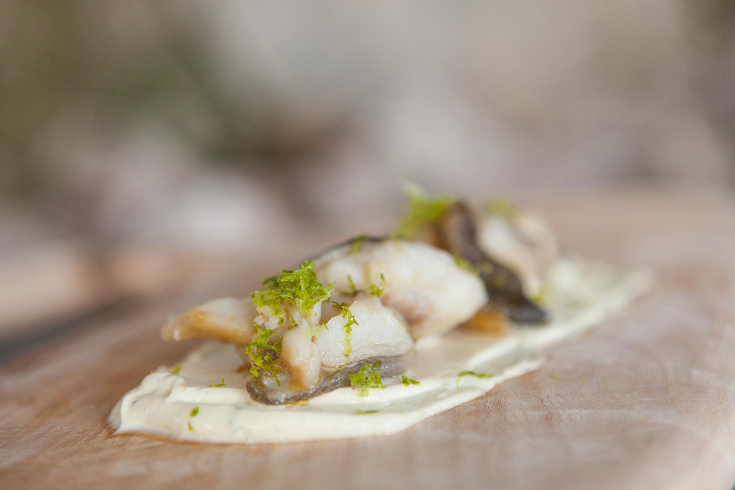 Corte o bacalhau fresco em cubos pequeninos.Pique o cebolinho e na hora de servir coloque-os no prato sob um aro e regue com a sopa por cima.